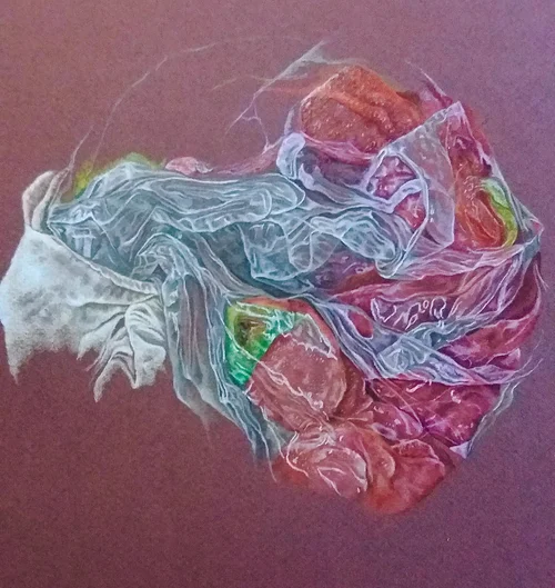 Watercolor on paper, wax, human hair, dragon fruit, micron pen, screen print